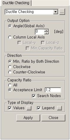 Output Option Select a method for generating RC C/B Flexural Capacity Ratio (Refer to Note 1). Angle(Global Axis): Display ratios with respect to the global coordinate system. Column Local Axis: Display ratios with respect to the element local coordinate system of the lower column at a beam-column joint. Local-y: Display the flexural capacity ratio with respect to the element local z-axis of the lower column at a joint. Local-z: Display the flexural capacity ratio with respect to the element local y-axis of the lower column at a joint. Min. Capacity Ratio: Display the lesser of the flexural capacity ratios with respect to the element local y- and z-axes of a lower column. Note This option becomes activated only when both Local-y and Local-z are checked on.