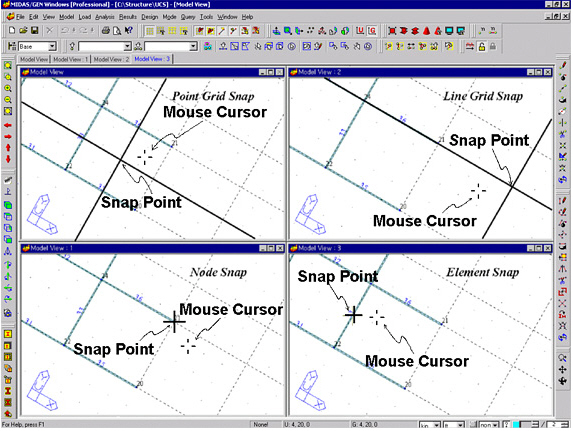 When creating nodes or elements or assigning attributes with the mouse cursor and if the mouse is moved to the vicinity of a desired grid, node or element, Snap allows the mouse cursor to automatically snap to the relevant position. |