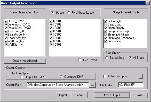 When the construction stage analysis is carried out, all the construction stages are listed. We simply select the stages of interests to be included in the batch output. If no construction stage analysis is performed, the column in the dialog box becomes inactive and lists load (combination) conditions.