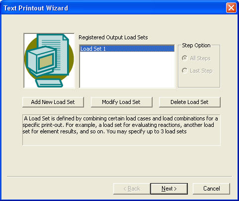 A Load Set is a collection of load combinations. Each Load Set serves a different purpose for output production, such as member force, nodal displacement, support reaction, etc.