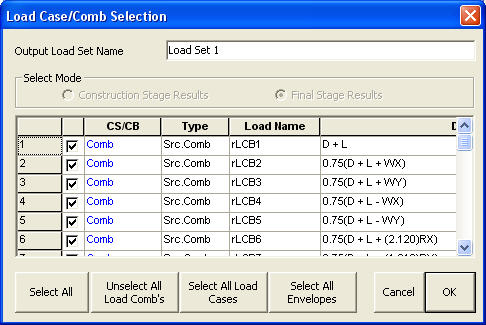 Enter the load set name. Check in ( ) the required load cases/load combinations/envelopes and