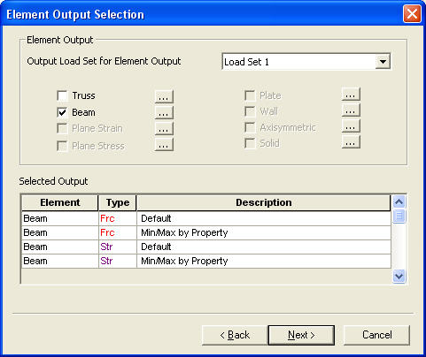 The output modes can be assigned in Select Output. Frc and Str stand for Force and Stress respectively. If [Min/Max by Property] is selected, the maximum and minimum values for each section type can be checked.