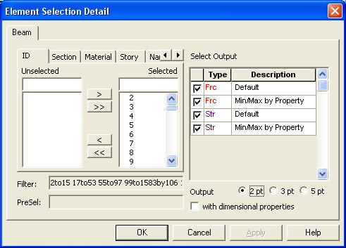 The Element Selection Detail dialog box has two parts: the filter setting part for the selection of the elements to be output to the left and the part for the output type and other items to the right. Filter can be applied to ID, Section, Material, Story, Named Plane and Group. Only the elements satisfying all the attributes selected in Filter are finally output. The elements that satisfy the filter conditions are arranged in the [Filter:] field. The elements previously selected in the window before starting Text Output are arranged in the [PreSel:] field. The assemblage of these two parts is finally output.