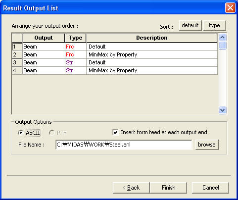 The output order can be sorted by default and by types. Changes are possible by individually selecting and dragging with the mouse. Check in [Insert form feed at each output end] to insert a page mark in the document at the end of each output. Write the output file path and name in the File Name field and click to create the document and view the created file in the Text Editor. Refer to the Output section for producing output using the Text Editor.