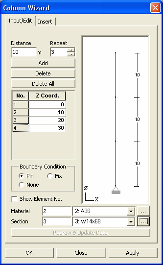 Use Column Wizard to auto-generate a number of vertical Beam Elements along the same line. |