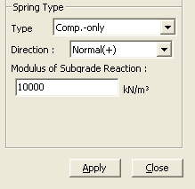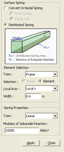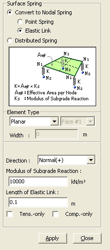 Enter spring stiffness per unit supporting area of planar or solid elements to create elastic spring supports. Elastic Link elements may be created simultaneously. This function is mainly used to define a number of elastic supports on surfaces represented by the modulus of spring. For example, if the user wishes to define elastic supports for subgrades of foundations or underground structures, subgrade springs will be automatically entered at each node represented by concentrated stiffness. This function enables the user to specify the surface or line stiffness without having to worry about the discretization (sizes) of elements, which is automatically taken care of by the program. | ||||||||||||||||||||||