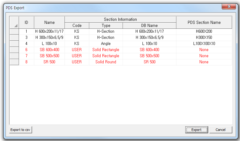 Code : Section Code defined in midas nGen file. If not defined, it is expressed as USER.