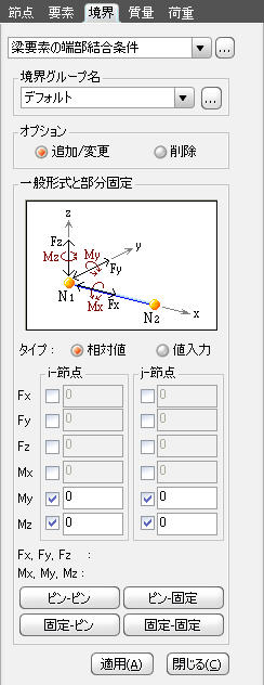 追加/変更 : 任意の梁要素の両端部結合条件を新規または変更入力する場合に指定