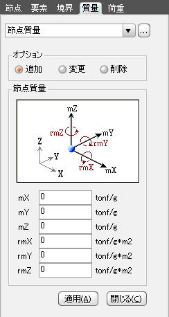 mX : 集中質量の全体座標系X軸方向の並進成分 mY : 集中質量の全体座標系Y軸方向の並進成分 mZ : 集中質量の全体座標系Z軸方向の並進成分 rmX : 集中質量の全体座標系 X軸に対する回転成分 rmY : 集中質量の全体座標系 Y軸に対する回転成分 rmZ : 集中質量の全体座標系 Z軸に対する回転成分