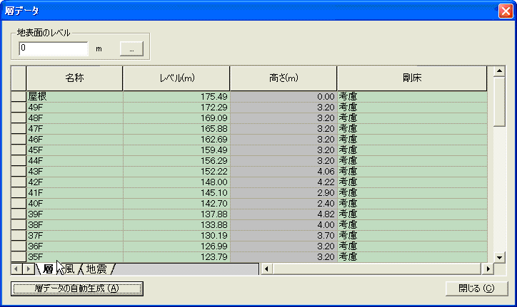 : このボタンをクリックすれば、入力された構造物の形状データを使って層, 風, 地震テーブルデータを