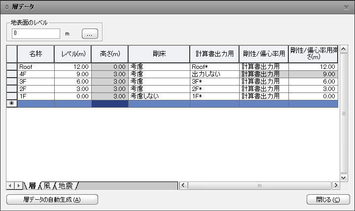 ここで、地表面レベルを入力すると、地下層を考慮することができます。地下層には自動生成された風荷重及び地震荷重が適用され