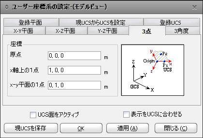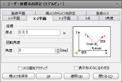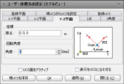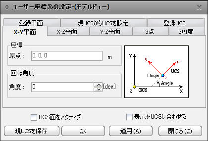 ダイアログで、希望するタブを選択し、関連データを入力します。 UCS面をアクティブ UCSの原点を含むx-y平面だけがアクティブになります。モデルの残り部分をアクティブ状態に戻す場合は 表示をUCSに合わせる UCSの (+)z軸方向から見た状態で、視点を自動に変更します。