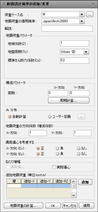 Ai分布自動計算とした場合、地震荷重を適用する方向と大きさを入力します。