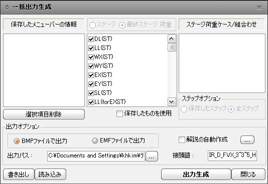 出力オプション 出力ファイルの形式 一括出力する画像ファイルの形式を指定します。 BMPとEMFのどちらかを選びます。 解説の自動作成 一括製作される画像ファイルの左側上端に、解析結果の種類と成分、施工段階とステップ及び荷重ケース (荷重組合わせ条件)などを説明する解説を自動生成して出力します。 大きさと色相、フォントなどを変更することができます。 出力パス 一括製作された画像ファイルを保存する経路を指定します。 接頭語 :生成される画像ファイルの名前に適用される接頭語を指定します。 ファイル名は"接頭語"_"ベースファイル名 "_"荷重組合わせ".bmp(emf) または"接頭語"_"ベースファイル名"_"ステージ"_"ステージ荷重ケース"_"ステップ".bmp(emf) に設定されます。