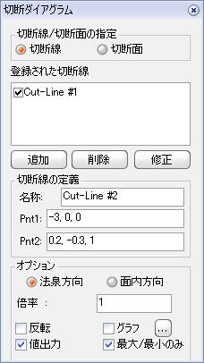 切断線の定義切断線を登録します。 名称 : 登録する切断線の名称 Pnt1: 切断線の開始点 Pnt2 : 切断線の終了点 オプション変形図を表示させる向きを指定します。 法線方向 : 板要素の要素面に対して法線方向に変形図を表示します。 面内方向 : 板要素の面内方向に変形図を表示します。 倍率 : 表示倍率を指定します。 グラフ : 変形を新規ウィンドウにグラフで表示します。(切断線を選択した場合にだけ有効です。) グラフウィンドウの形式を指定するダイアログを呼び出します。 別々に表示 : 複数の切断線または切断面に対するグラフをそれぞれ別のウィンドウに表示します。 すべてを1枚に表示 : 複数の切断線または切断面に対するグラフを1つのウィンドウに表示します。 X-軸 : グラフのX軸のパラメータを指定します。 Pnt1からの距離 : 1番目の点(Point)からの距離 X-軸座(GCS) : 全体座標系のX軸座標 Y-軸座(GCS) : 全体座標系のY軸座標 Z-軸座(GCS) : 全体座標系のZ軸座標