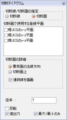 ■切断面を選択した場合 切断面で使用する登録平面 ユーザー座標系のx-y, x-z, y-z平面及び登録平面の中から任意の平面を選択します。 要素面の法線方向 : 板要素の要素座標系z軸方向に変形図を表示します。 切断面上 : 切断面の面内方向に変形図を表示します。 連続線を描画 : 同一平面にない板要素の変形図を連続線で表示します。 倍率 : 表示倍率を指定します。 値出力 : 数値を表示します。 最大/最小のみ : '値出力'の場合に最大及び最小値のみを表示します。