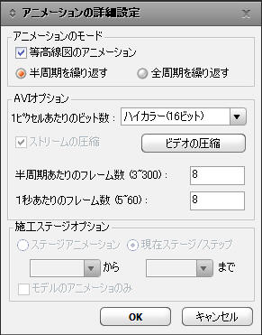 施工ステージオプション 施工段階別解析を行った場合のアニメーション出力方法を指定します。 ステージアニメーション:施工段階別アニメーションを指定します。 現在ステージ/ステップ:現在施工段階でステップ別アニメーションを指定します。 から~まで:アニメーションの開始と終了になる施工段階またはステップを選択します。 開始時間:解析結果のアニメーション出力開始時間を入力します。 終了時間:解析結果のアニメーション出力終了時間を入力します。 時間増分:アニメーション出力時に解析結果を出力する時間増分を入力します。 【初期時間の設定】:動画出力に使用される時間を初期状態に設定します。