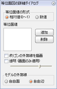 等位面図 : 水和熱解析によって発生した任意の応力値に対する等位面図を現わします。水和熱の解析によって発生した応力の等位面を設定するための、詳細設定のダイアログボックスが下記のように現われます。