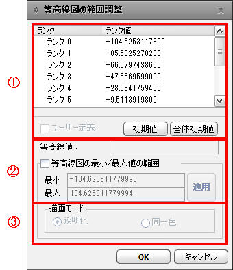 等高線図の範囲調整ユーザー定義 : 最大値(Rank 11)、最小値(Rank 0)を除いた範囲内の値を指定することができます。 変更しようとするランクを選択した後にユーザ定義のチェックボックスをオンにすると、等高線値を入力することが できます。(①) 等高線値図の最小/最大値の範囲 : 出力値の最大、最小値より外の値をユーザーが指定することができます。(②) 描画モード : ユーザーが最大、最小値の出力範囲を減らした時、減らした範囲に対する表現方法を指定します。(③) 透明化: 透明で表示 同一色: 変更する前と同じ色で表示 色数 : 等高線図に含まれる色数を指定します。(6, 12, 18,24個の色数の中から選択します。) 色相 : 等高線図の色を指定または調整します。 色相表 : 色を指定します。