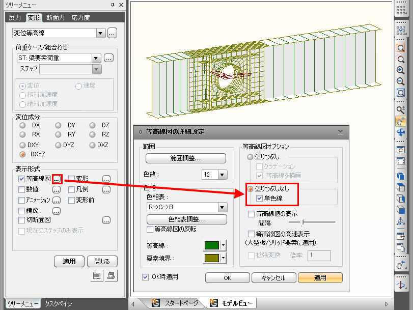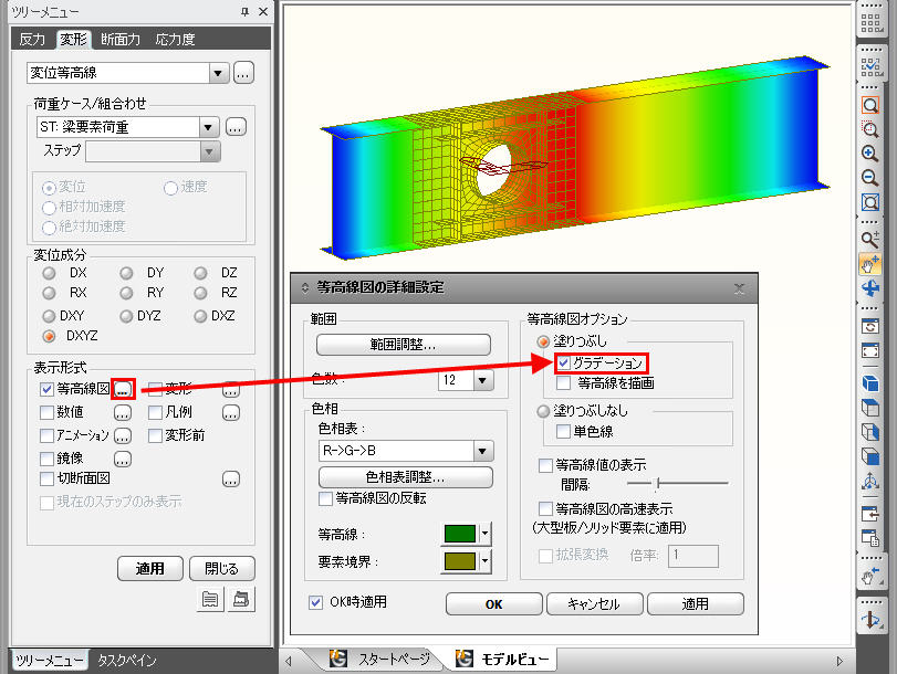 等高線図の反転 :等高線図の色の変化に対して、その順序を逆順にします。 等高線 : 等高線図の境界線の色を指定します。 要素境界 : 要素の境界線の色を指定します。 等高線図オプション : 等高線図の表示形式を設定します。 塗りつぶし グラデーション : 等高線図のそれぞれの色をなめらかに変化させて表示します。