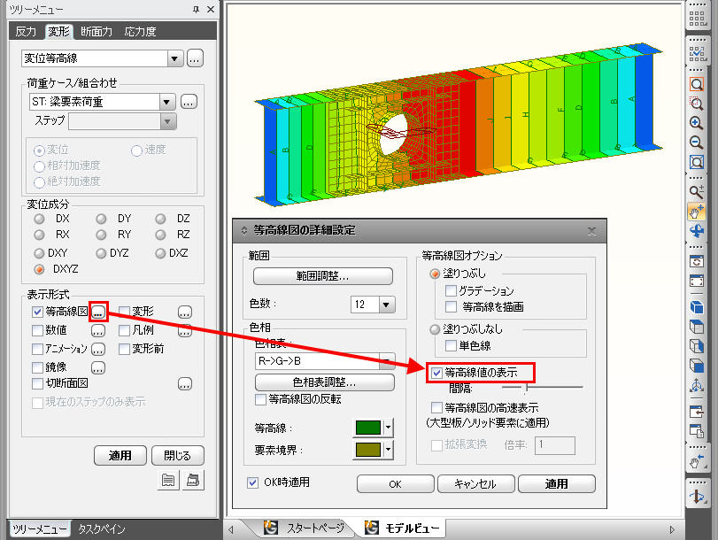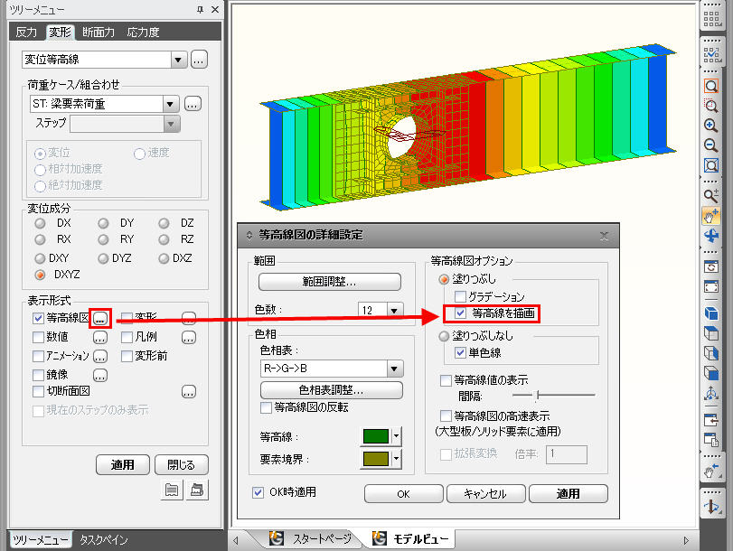 等高線値の表示の間隔調整機能等高線図の高速表示(大型板/ソリッド要素に適用) 板要素やソリッド要素を使用した大型モデルにおいて、等高線図を表示するのにかかる時間を短縮するために 簡略化した等高線図を表示します。 拡張変換 板要素または切断面に沿ってソリッド要素の等高線図を表示する場合に、要素座標系z軸方向を解析結果値の 正(+)方向として適用した3次元の等高線図で表現します。 このオプションは、変形図と同時に使用することができません。 また、板要素の厚さが表現される隠面処理オプションや上面と下面の断面力(応力度)を同時に表現するオプションと 同時に使用することもできません。