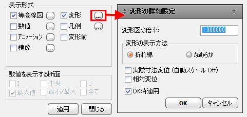 変形の詳細設定変形図の倍率 モデル画面に表示される変形図の倍率を設定します。 変形の表示方法 変形の表示形式を選択します。 折れ線 : 節点変位のみの変形図を表示します。 なめらか : 節点変位の表示とともに、梁要素の場合には、全区間にわたって詳細な変形量を計算して表示します。 相対変位 画面に表示された節点変位の中の最小値を"0"とした時の相対変位を変形図で表示します。