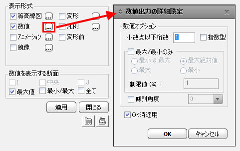 変数値出力の詳細設定小数点以下桁数 : 数値の小数点以下桁数を指定します。 指数型 : 指数型で表示する場合に選択します。 最小 & 最大 : 支点反力の最大、最小値を表示します。 絶対値最大 : 絶対値が最大になる数値を表示します。 最大 : 最大値のみを表示します。 最小 : 最小値のみを表示します。 制限値(%) : 選択された最大または最小値を基準にして画面表示する支点反力の範囲を設定します。 傾斜角度 : 数値の傾斜角度を設定します。 Note 小数点以下桁数の初期値は、プレファレンスで設定することができます。傾斜角度が"0"の時は節点または要素の右側に 水平に表示され、反時計回りで角度が適用されます。適切な角度を入力すれば、数値が読み取りやすくなります。