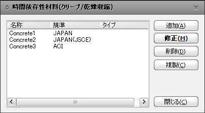 時間依存性材料(クリープ/乾燥収縮)の追加及び修正ダイアログ
