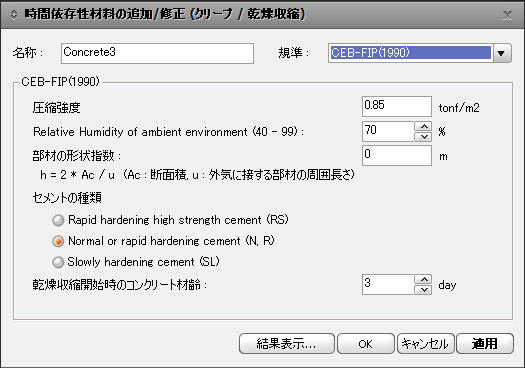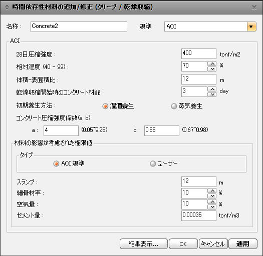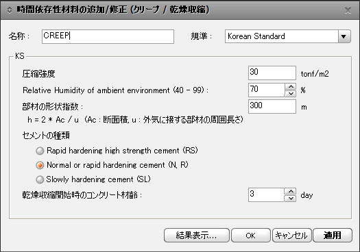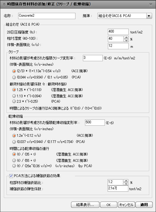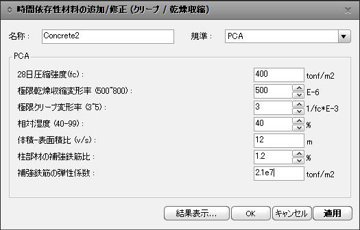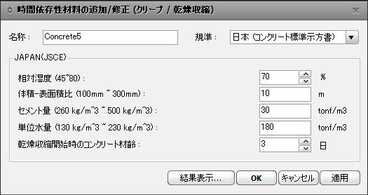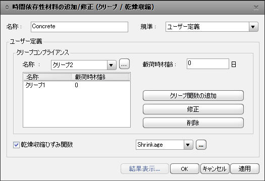 時間依存性材料(クリープ/乾燥収縮) ダイアログボックス