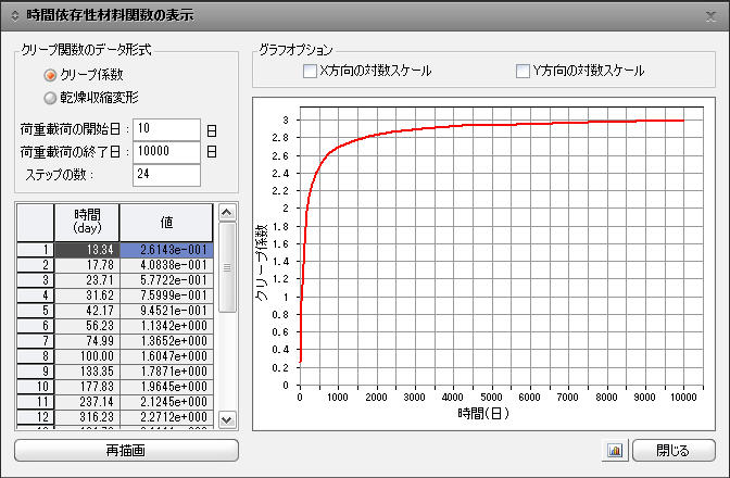 "時間依存性材料(クリープ/乾燥収縮)関数"のダイアログボックスを呼び出します。