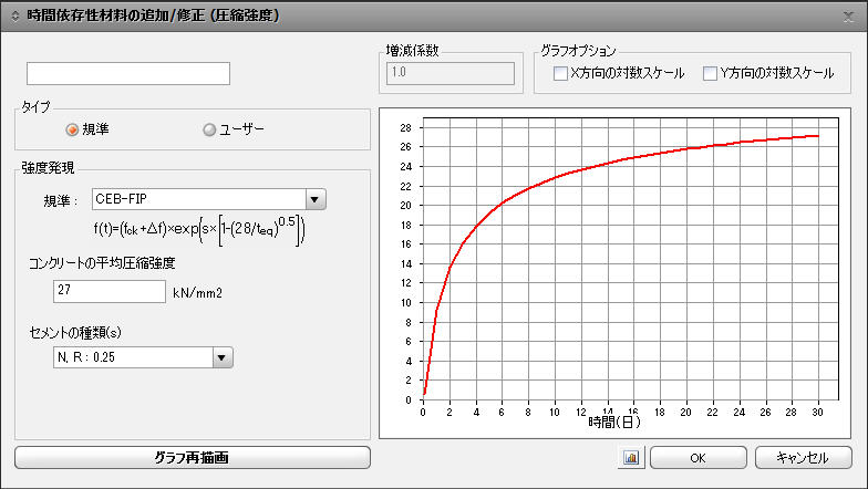 時間の流れによる材料の特性を時間依存性材料(クリープ/乾燥収縮)関数で、ユーザーが直接定義して適用する方法です。