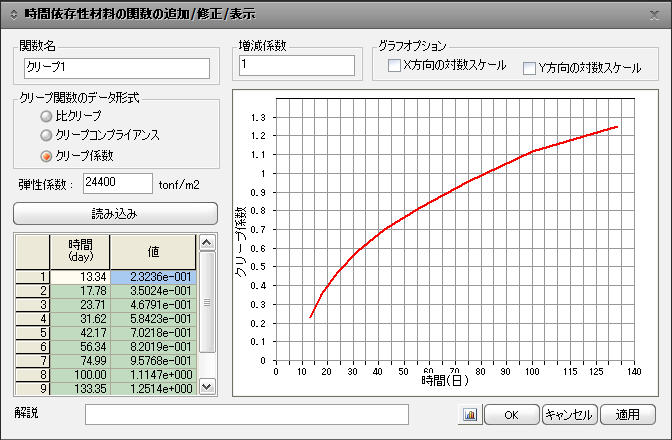 関数名 : クリープを定義する関数の名称を入力します。この名称は、時間依存性材料の追加/修正(クリープ/乾燥収縮)ダイ