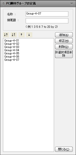 PC鋼材をグループで定義するためグループを生成したり削除、グループの名称の修正を行います。 PC鋼材グループを設定すると、PC鋼材の座標、応力、プレストレス損失などをPC鋼材グループごとに確認することができますし、 PC鋼材の配置形状を定義する際には既に入力したPC鋼材グループを指定します。 |