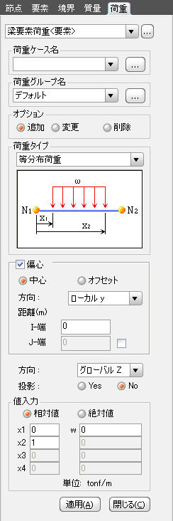 相対値 : 梁要素荷重の載荷位置を全長に対する相対比率で入力する場合に
