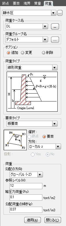 土圧または水圧による荷重を板要素、平面応力要素、平面ひずみ要素、またはソリッド要素の面または辺に入力します。 自重構造物に作用する横土圧を地下水位を考慮して入力することができます。 静水圧荷重は、与えられた圧力媒体の表面から該当する要素の連結節点までの距離に比重を掛け、要素の各節点に等価な集中荷重として入力されます。