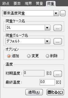 要素の温度荷重が属する荷重グループを選択します。荷重グループを追加する場合や、修正するためには、右側の ボタンをクリックし、"荷重グループの定義"ダイアログボックスを呼び出します。
