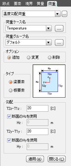 ここでαは線膨張係数で, Eは弾性係数、Iは梁要素の断面2次モーメント、ΔTは最縁端での温度差、hは梁要素断面の最縁端間の距離、tは板要素の厚さ、νはポアソン比をそれぞれ意味します。 |
