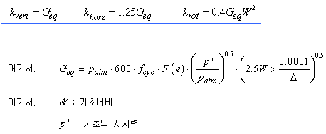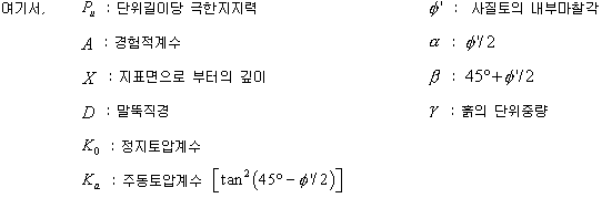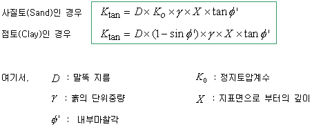 Soil Type : Sand / Soft Cray / Stiff CrayÀÇ ¼¼°¡Áö·Î ±¸ºÐÇÒ ¼ö ÀÖÀ¸¸ç, ¼±ÅÃÇÏ´Â Åä»çÀÇ Á¾·ù¿¡ µû¶ó °¼º°è»ê ¹æ¹ýÀÌ ´Þ¶óÁý´Ï´Ù. ¾Æ·¡ÀÇ ½ºÇÁ¸µ°¼º °è»ê¹æ¹ýÀ» ÂüÁ¶ÇϽñ⠹ٶø´Ï´Ù. Ground Level : ÁöÇ¥¸éÀÇ ZÁÂÇ¥ Pile Diameter(D) : ¸»¶ÒÀÇ Áö¸§ Unit Weight of Soil(¥ã) : ÈëÀÇ ´ÜÀ§Áß·® Earth Pressure Coeff. at rest(K0) : Á¤ÁöÅä¾Ð°è¼ö Coeff. of Subgrade Reaction(Kh) : Áö¹Ý¹Ý·Â°è¼ö Internal Friction Angle (¥Õ) : ÈëÀÇ ³»ºÎ¸¶Âû°¢ Initial Soil Modulus(k1) : »ó´ë¹Ðµµ¿¡ µû¶ó °áÁ¤µÇ´Â »ó¼ö·Î ¸»¶ÒÀÇ ¼öÆò¹æÇâ ºñ¼±Çü ź¼º½ºÇÁ¸µÀÇ °¼º°áÁ¤¿¡ »ç¿ëµË´Ï´Ù. ¾Æ·¡ÀÇ kÁ¡°ú mÁ¡ÀÇ Á¤ÀÇ ºÎºÐÀ» ÂüÁ¶ÇϽñ⠹ٶø´Ï´Ù. |
