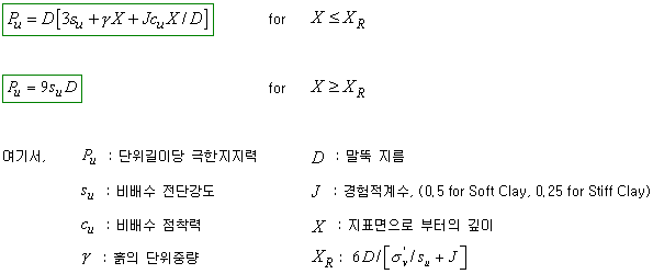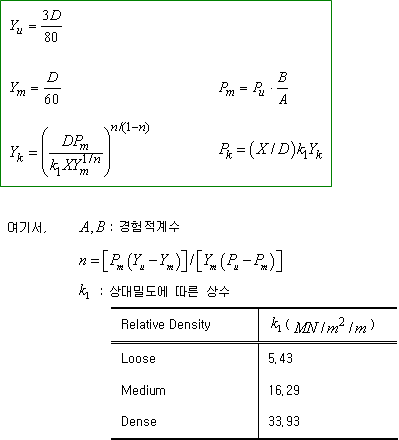 ÀÓÀÇ ±íÀÌ X¿¡¼ Ⱦº¯À§ Y¿Í ´ÜÀ§±æÀÌ´ç Áö¹Ý¹Ý·Â(kN/m)ÀÇ °ü°è´Â ¿ÞÂÊÀÇ ±×·¡ÇÁ¿Í °°Àº °ü°è¸¦ °¡Áý´Ï´Ù. ÀÓÀÇ ±íÀÌ X(Áï, Áö¹Ý½ºÇÁ¸µÀÇ À§Ä¡)¿¡¼ Pk, Pm, Pu, Yk, Ym, YuÀÇ °ªÀÌ Á¤Àǵ˴ϴÙ. Áö¹ÝÀÇ Á¾·ù¿¡ µû¶ó Pu¸¦ Á¤ÀÇÇÏ´Â °è»ê¹æ¹ýÀÌ ´Þ¶óÁö¸ç, Pk, Pm, Yk, Ym, Yu ÀÇ À§Ä¡´Â Pu¸¦ ÅëÇØ µ¿ÀÏÇÑ ¹æ¹ýÀ¸·Î °è»êµË´Ï´Ù. °è»ê¹æ¹ýÀº Å©°Ô Sand¿Í Clay·Î ºÐ·ùµÇ¸ç, J°ªÀ» ´Ù¸£°Ô Àû¿ëÇÏ¿© Soft Clay¿Í Stiff Clay·Î ±¸ºÐÇÕ´Ï´Ù. |