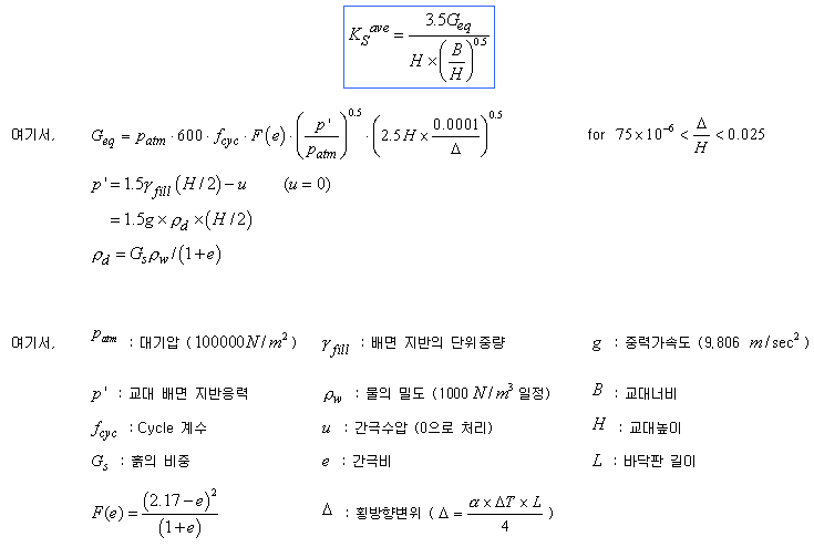 Void Ratio (e) : ±³´ë ¹è¸é ÈëÀÇ °£±Øºñ Specific Gravity (Gs) : ±³´ë ¹è¸é ÈëÀÇ ºñÁß, ÀϹÝÀûÀ¸·Î 2.65¸¦ »ç¿ëÇÕ´Ï´Ù. Cycle factor (fcyc) : [Cosgrove et al (2001)]°ú cycle¿¡ µû¸¥ °ø±Ø·üÀÇ °¨¼Ò·Î 2ÀÇ °ªÀ¸·Î Á¤ÀÇÇÕ´Ï´Ù. ¿ÂµµÇÏÁß¿¡ ÀÇÇØ »óºÎ±¸Á¶°¡ ÆØÃ¢/¼öÃàµÇ°í, ÀÏÃ¼ÈµÈ ±³´ëµµ ÇÔ²² º¯ÇüÇÏ°Ô µË´Ï´Ù. ÀÌ CycleÀÌ ¹«ÇÑÈ÷ ¹Ýº¹µÉ ¶§ÀÇ »óŸ¦ °æÇè½ÄÀ¸·Î Ç¥ÇöÇÒ ¶§, »ç¿ëµÇ´Â »ó¼öÀÔ´Ï´Ù.