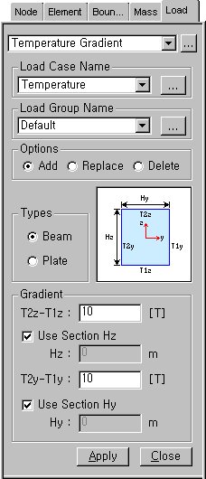 Types, Gradient Temperature Gradient¸¦ ÀÔ·ÂÇÒ ¿ä¼ÒÁ¾·ù¸¦ ¼±ÅÃÇÏ°í ¾È³»±×¸²À» ÂüÁ¶ÇÏ¿© µ¥ÀÌÅ͸¦ ÀÔ·ÂÇÕ´Ï´Ù. Beam : º¸¿ä¼ÒÀÏ °æ¿ì ÁöÁ¤ T2z - T1z : ¿ä¼ÒÁÂÇ¥°è zÃà ¹æÇâÀÇ Ãֿܴܰ£ÀÇ ¿ÂµµÂ÷ Use Section Hz : ´Ü¸éÁ¤º¸ÀÇ Ä¡¼ö¸¦ ±×´ë·Î Àû¿ë Hz : ¿ä¼ÒÁÂÇ¥°è zÃà ¹æÇâÀÇ Ãֿܴܰ£ÀÇ °Å¸® T2y - T1y : ¿ä¼ÒÁÂÇ¥°è yÃà ¹æÇâÀÇ Ãֿܴܰ£ÀÇ ¿ÂµµÂ÷ Use Section Hy : ´Ü¸éÁ¤º¸ÀÇ Ä¡¼ö¸¦ ±×´ë·Î Àû¿ë Hy : ¿ä¼ÒÁÂÇ¥°è yÃà ¹æÇâÀÇ Ãֿܴܰ£ÀÇ °Å¸® Plate : ÆÇ¿ä¼ÒÀÏ °æ¿ì ÁöÁ¤ T2z - T1z : ¿ä¼ÒÁÂÇ¥°è zÃà ¹æÇâÀÇ Ãֿܴܰ£ÀÇ ¿ÂµµÂ÷ Use Section Hz : ´Ü¸éÁ¤º¸ÀÇ Ä¡¼ö¸¦ ±×´ë·Î Àû¿ë Hz : ÆÇ¿ä¼ÒÀÇ µÎ²²