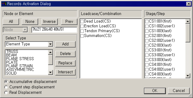 Displacements Table ±â´ÉÀ» ½ÇÇàÇϸé Records Activation Dialog°¡ È£ÃâµÇ°í ¿©±â¿¡¼ Ãâ·Â´ë»ó ÀýÁ¡°ú ¿ä¼Ò, ÇÏÁßÁ¶°Ç, ½Ã°ø´Ü°è µîÀ» ¼±ÅÃÇÑ ÈÄ ¹öưÀ» Ŭ¸¯ÇÕ´Ï´Ù. À» Ŭ¸¯ÇÏ¸é ¸ðµç ´ë»ó¿¡ ´ëÇÏ¿© Å×À̺íÀ» Ãâ·ÂÇϸç, °æ¿ì¿¡ µû¶ó¼´Â »ó´çÇÑ ½Ã°£ÀÌ ¼Ò¿äµÉ ¼ö ÀÖ½À´Ï´Ù.