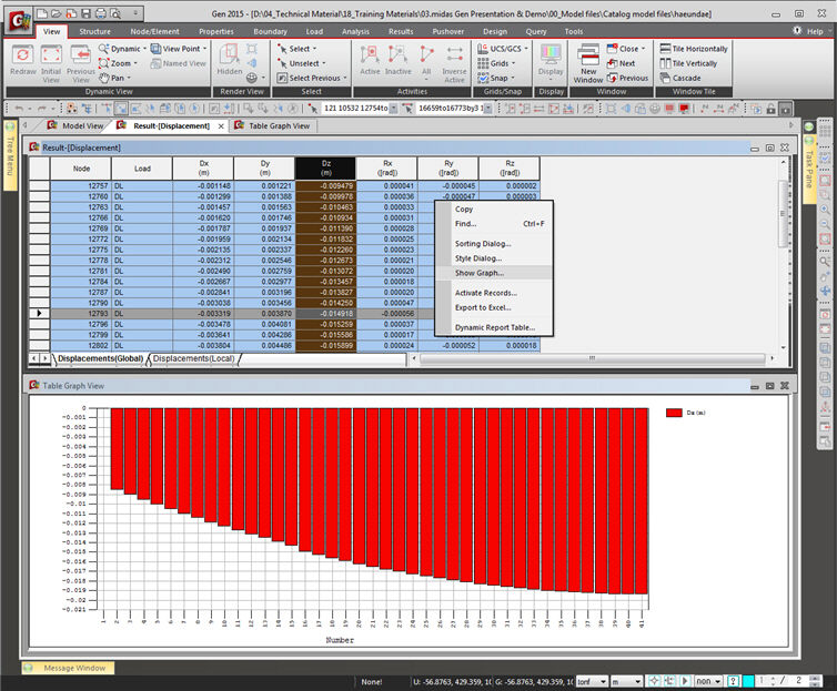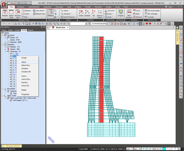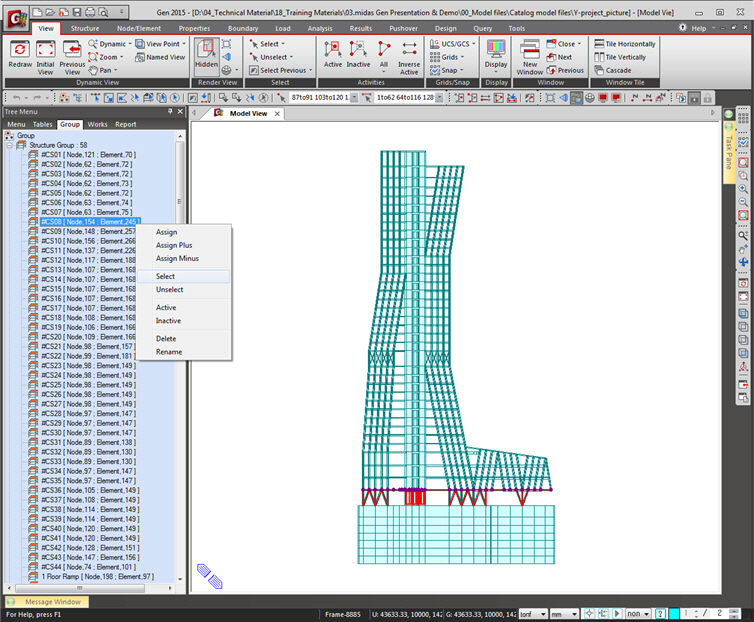 Menu Tree 탭에는 모델링, 하중입력, 해석, 설계에 사용되는 매뉴가 그룹화 되어있습니다. 이러한 Tree 의 구성은 Windows Explorer와 유사합니다. 매뉴를 더블클릭하여 관련 대화상자를 불러오거나 관련 입력창을 이동시킬 수 있습니다.