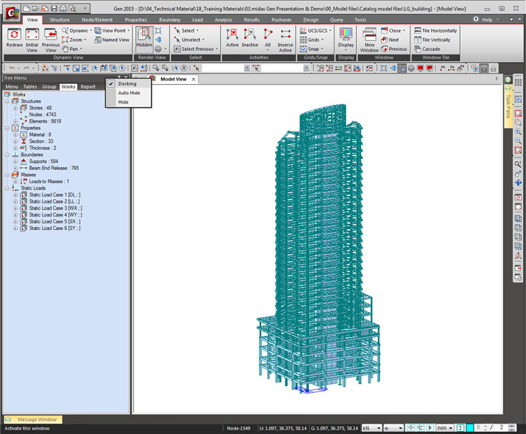 Tree Menu와 Task Pane, Message Window는 midas Gen 윈도우에서 어디든 위치시킬 수 있습니다. 또한 'Auto Hide'와 'Hide'를 클릭하여 보이게 하거나 숨길 수 있습니다.