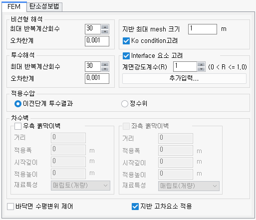 최대 반복계산횟수, 오차한계 : 지하수의 침투류(Seepage) 해석시 반복계산의 수렴기준을 입력합니다.