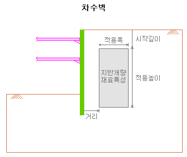 일반적으로 사용하는 차수공법인 S.G.R과 L.W에 대한 직접적인 입력은 불가능하지만, 그에 대응할 수 있는 지반물성치를 입력하여 차수효과를 발휘할 수 있도록 합니다. - 흙막이벽의 하단깊이보다 깊이 설치할 수 있습니다.
