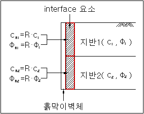 계면강도계수(R) : 점착력과 내부마착각에 계면강도계수를 곱하여 interface요소의 물성값을 계산합니다.