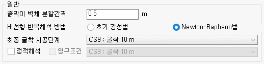 - 최대 반복계산횟수, 오차한계 : 비선형해석의 수렴기준을 입력합니다. 사용자가 입력한 두 가지의 수렴기준 중 하나를 만족하면 해당 시공단계의 해석이 수렴된 것으로 판단하여 다음 시공단계 해석을 수행합니다.
