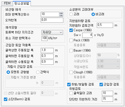 - 해석법이 "탄소성보법"인 경우에만 검토를 수행할 수 있습니다. 체크버튼을 통해 계산서 및 보고서에 히빙/보일링 검토 수행 여부를 판별합니다.