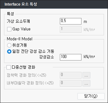 - 가상요소두께 : 인접 지반의 탄성계수를 Interface 요소의 경계면 강성으로 변환하기 위한 변수